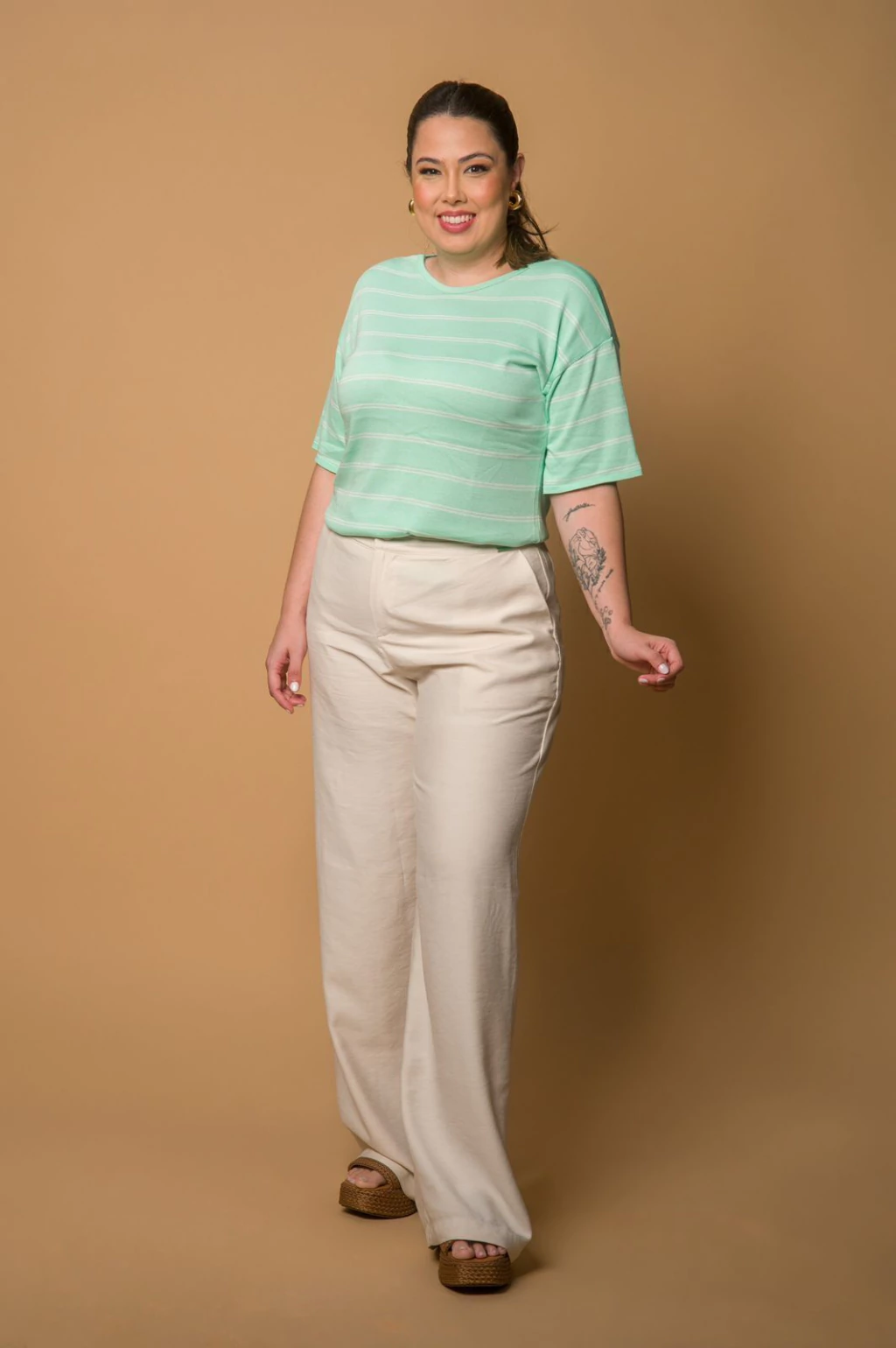 T SHIRT DE LISTRAS VISCOSE: Uma peça essencial para quem busca elegância com conforto. Confeccionada em viscose de alta qualidade, oferece toque suave e caimento fluido que valoriza a silhueta. As delicadas listras trazem um charme sutil, ideal para compor looks sofisticados e versáteis. Perfeita para ocasiões casuais ou eventos que pedem um visual refinado. Aposte nesta t-shirt para um estilo moderno e elegante